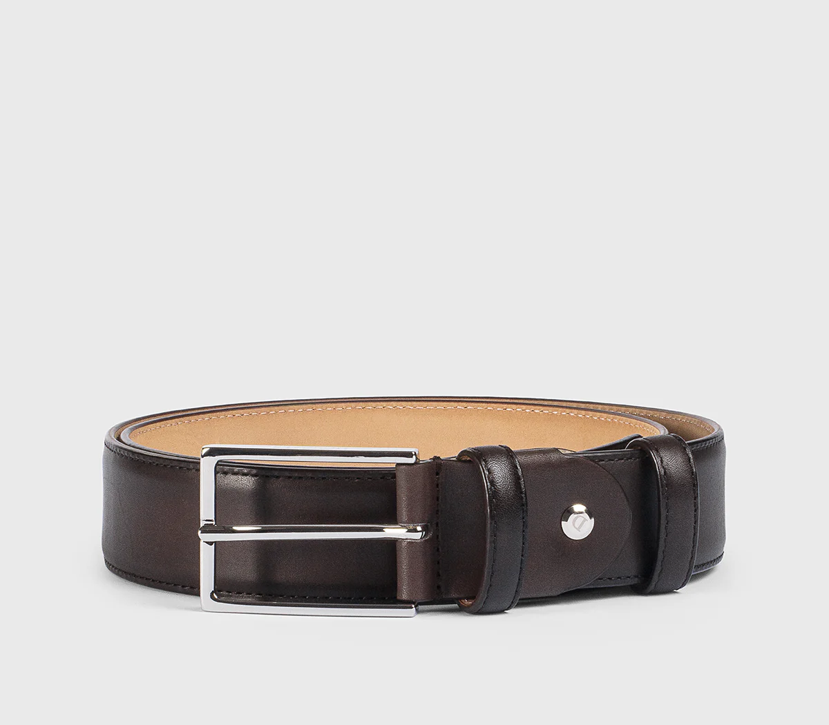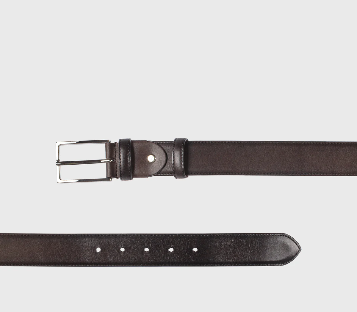 Ceinture réglable en cuir brun foncé avec boucle carrée en nickel poli et double passant en cuir assorti. Cet accessoire essentiel de la garde-robe devient synonyme de classe et d'élégance dans toute sa simplicité. Fabrication italienne.