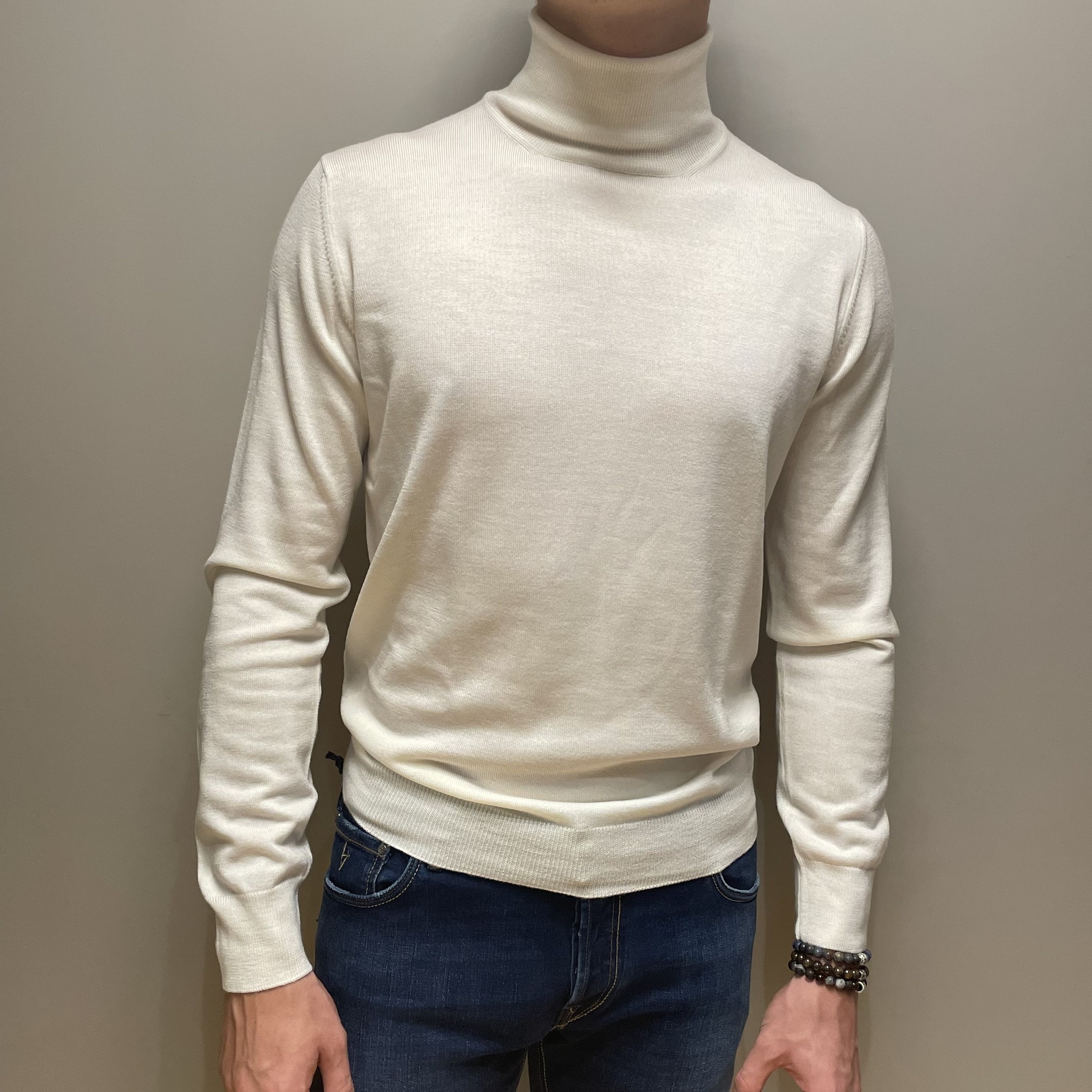 Pull à col roulé en laine mérinos extrafine. C'est un vêtement décontracté et basique, parfait pour créer toutes les combinaisons souhaitées. Les personnes les plus à la mode peuvent le porter avec une chemise, en laissant apparaître le col, tandis que pour avoir un look plus élégant, il peut être porté avec une veste.