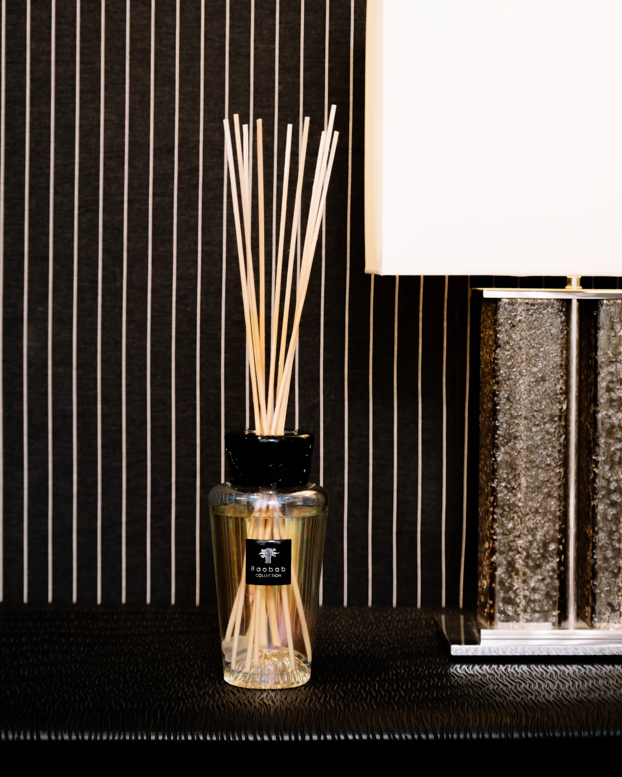 Le diffuseur de parfum d'intérieur Madagascar Vanilla est un bel objet avec des courbes douces. Le verre irisé est de couleur perle et son capuchon en bakélite noire est gravé de motifs de racines pour correspondre au dôme de la base du flacon.