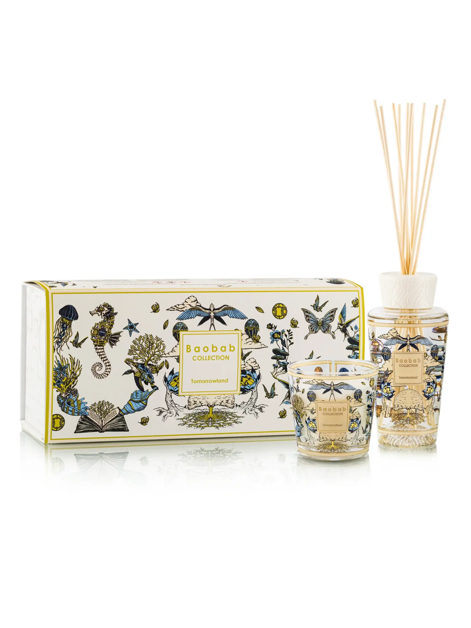 La quatrième collaboration Tomorrowland présente un diffuseur 500ml et une bougie en bleu profond raffiné, ornée d'illustrations dorées appliquées à la main inspirées des thèmes légendaires du festival. L'Arbre Mère, les oiseaux mythiques, les papillons et les créatures marines de Planaxis tissent une symphonie visuelle de transformation et d'émerveillement.