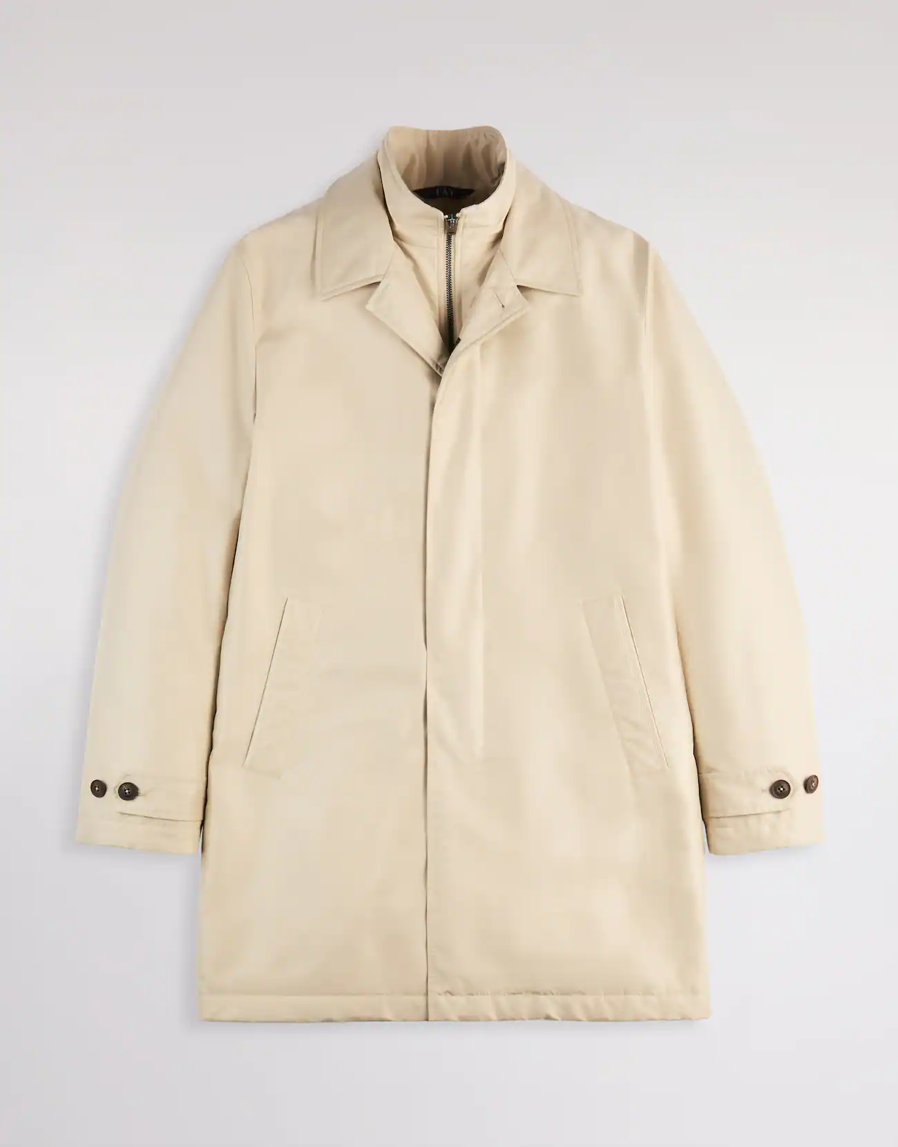 Avec des poches à passepoil et un bas de manche avec sangle et bouton, il possède une fermeture avec zip et boutons cachés rappelant l'univers des imperméables british. Le vêtement est complété par une petite poche interne.