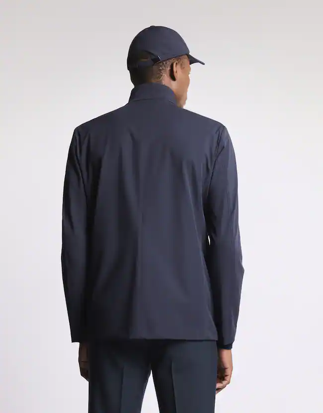 Veste Travel non doublée réalisée en nylon stretch avec traitement anti-pluie, pied de col et pinces frontales.