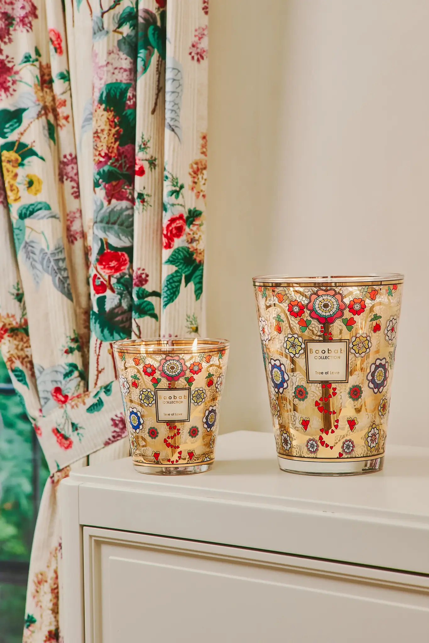 La bougie parfumée Tree of Love se distingue par son élégante sérigraphie dorée et multicolore, inspirée de l’iconographie des arbres de vie. Ses branches dorées sont ornées d’une profusion de fleurs dont les pétales en forme de cœur s’entrelacent.