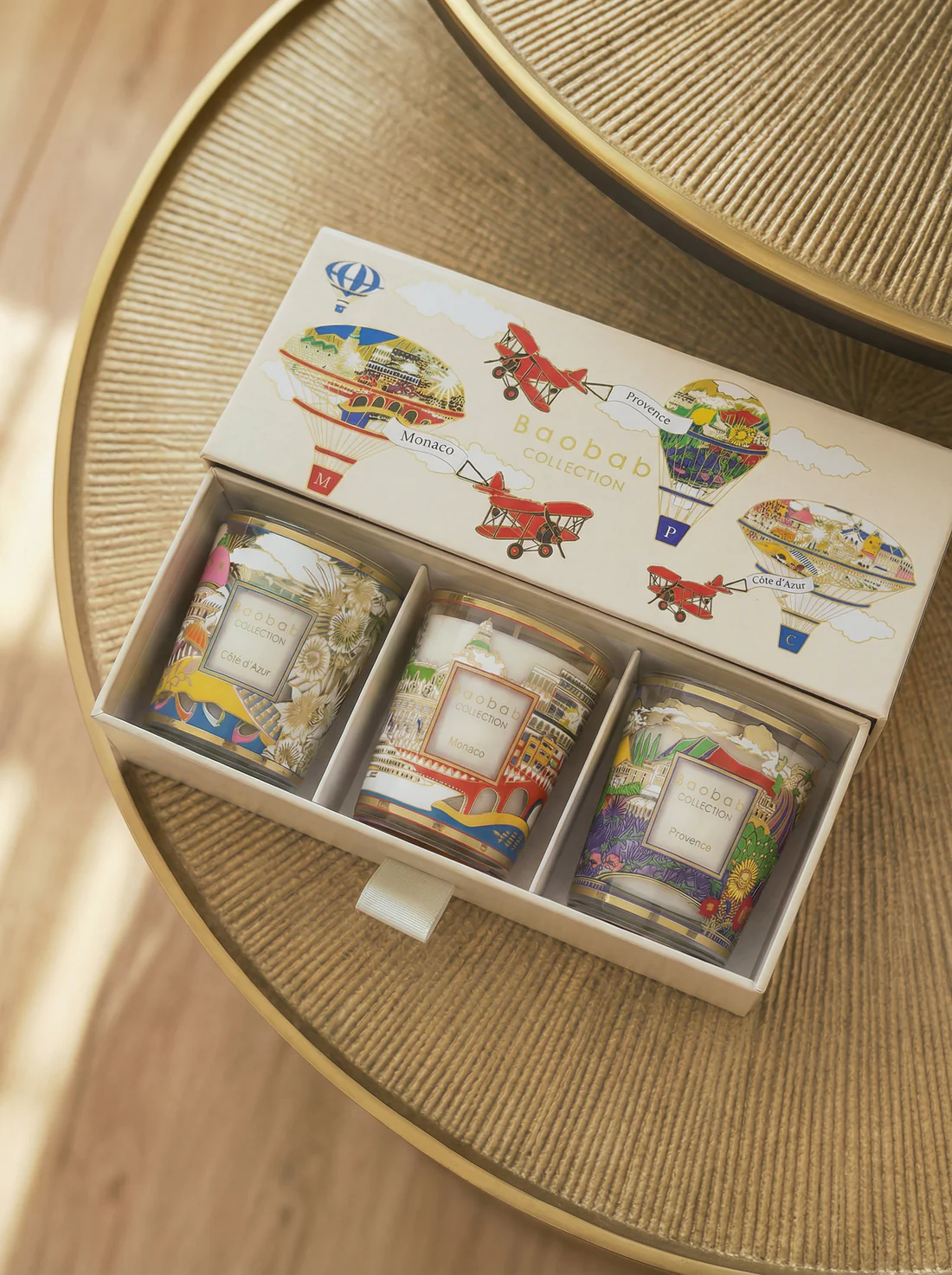 Le coffret cadeau « Cap vers le sud » rassemble trois mini bougies imaginées comme des escales le long de la côte méditerranéenne ou dans la campagne provençale. Présentées dans un coffret décoré de montgolfières colorées, chaque bougie est illustrée en fonction de sa destination, transformant ce trio en un véritable objet de collection à offrir ou à conserver comme souvenir d'été.
